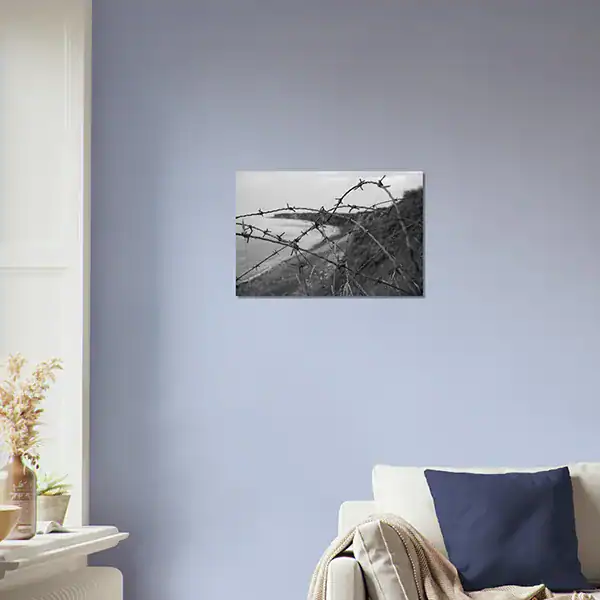 This photograph was taken along the Normandy coast in France, where remnants of World War II still shape the landscape today. Barbed wire stretches across the foreground, contrasting with the calm shoreline in the distance.