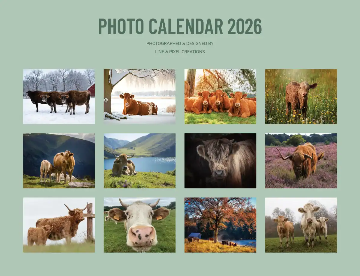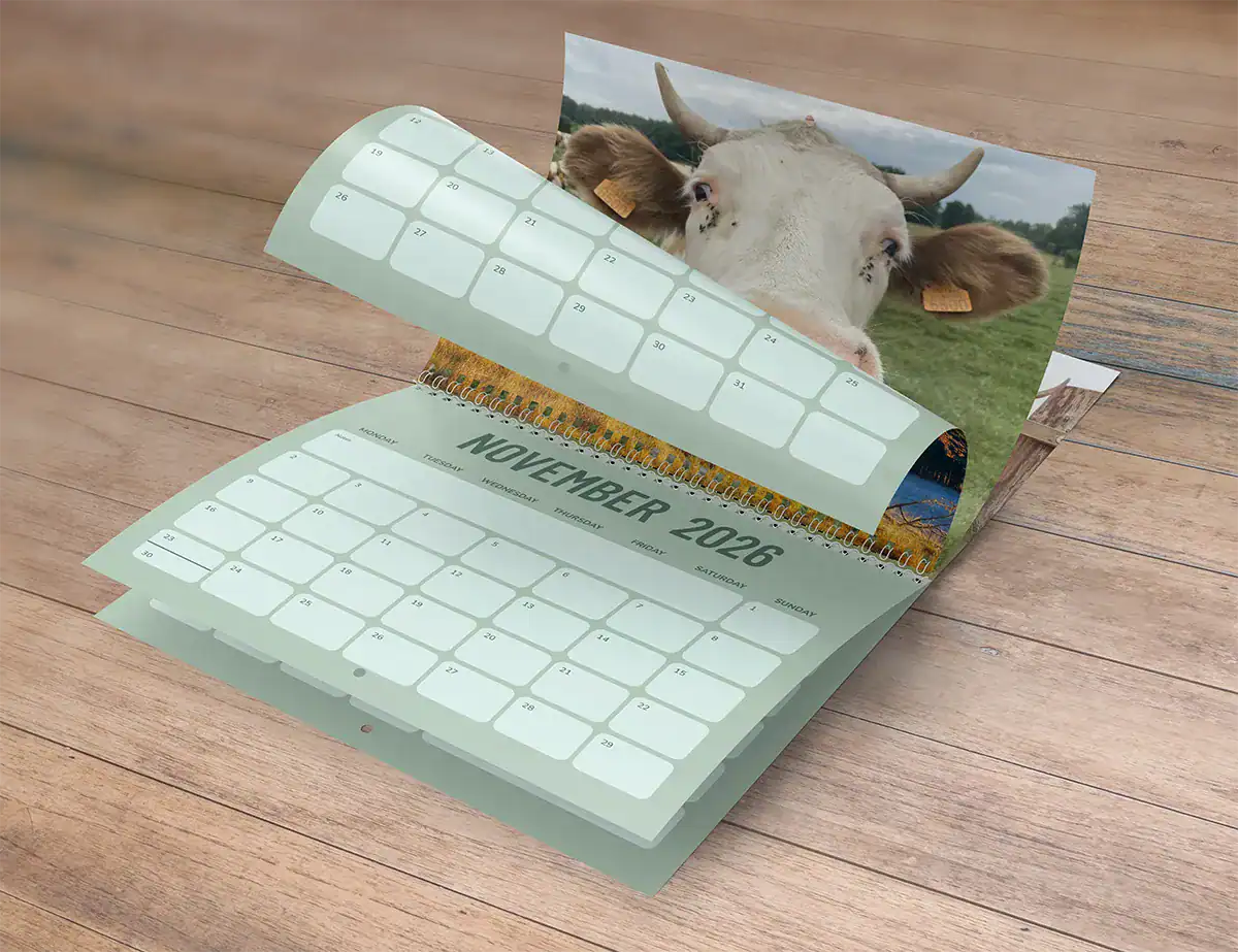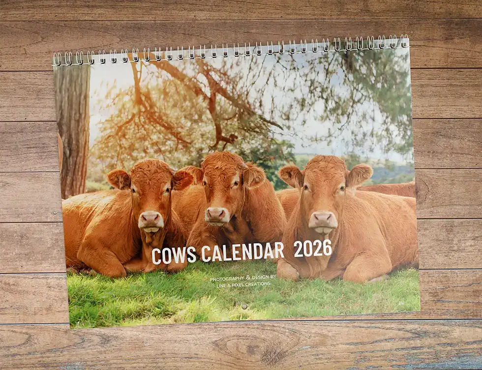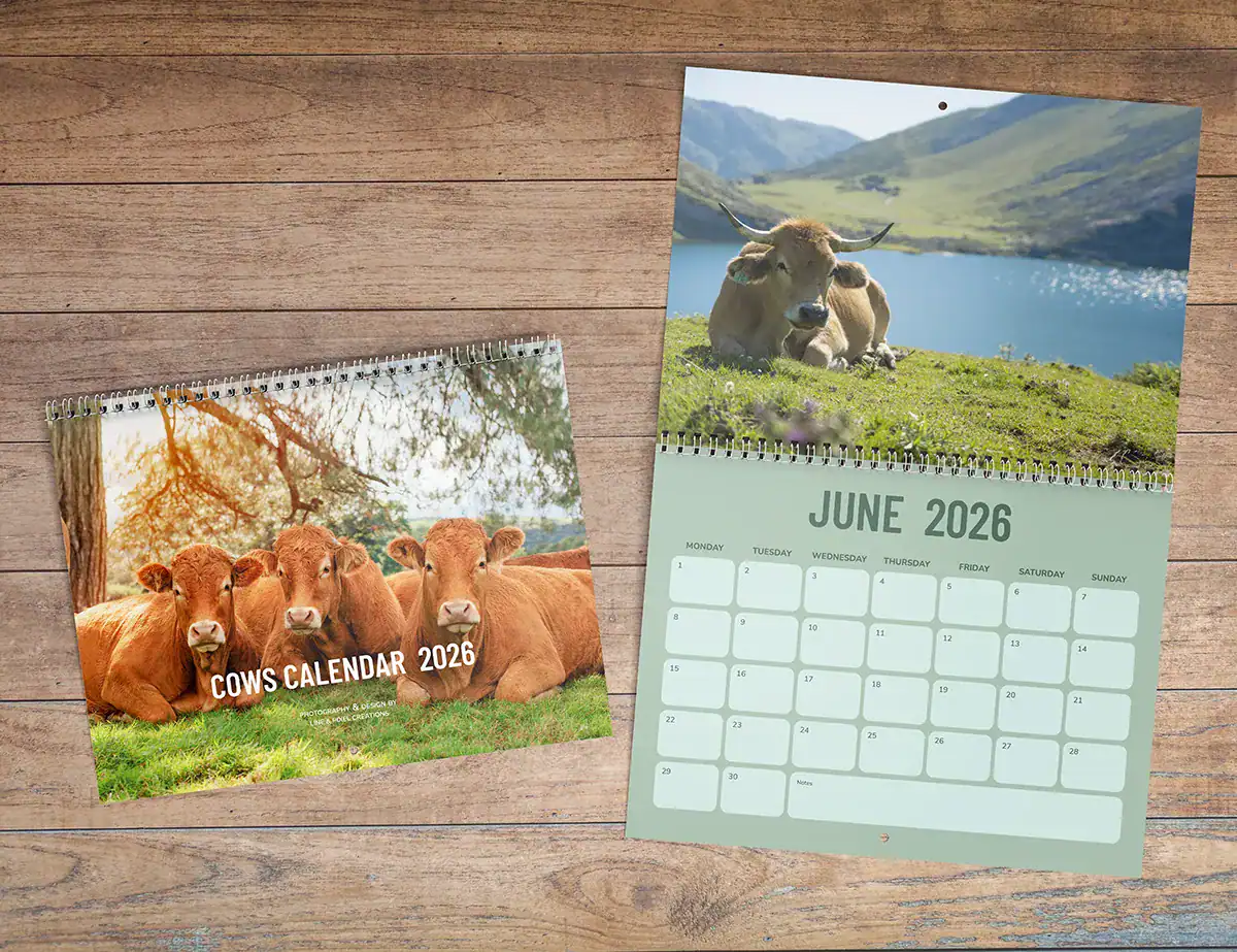 This cow wall calendar brings together close-up portraits and countryside scenes that highlight the gentle expressions and unique personalities of cows. From curious looks to calm moments in open fields, each month captures the quiet charm and character of farm life. A warm and inviting calendar that adds softness and nature to your everyday planning.