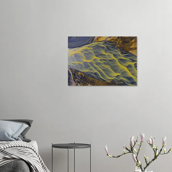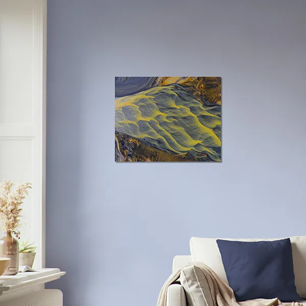 This photograph was captured from above in Iceland, revealing natural patterns formed by water, sand, and mineral-rich sediment. The flowing shapes and contrasting tones of yellow, grey, and dark earth create an almost abstract landscape — a reminder of how powerful and artistic nature can be when seen from a different perspective.